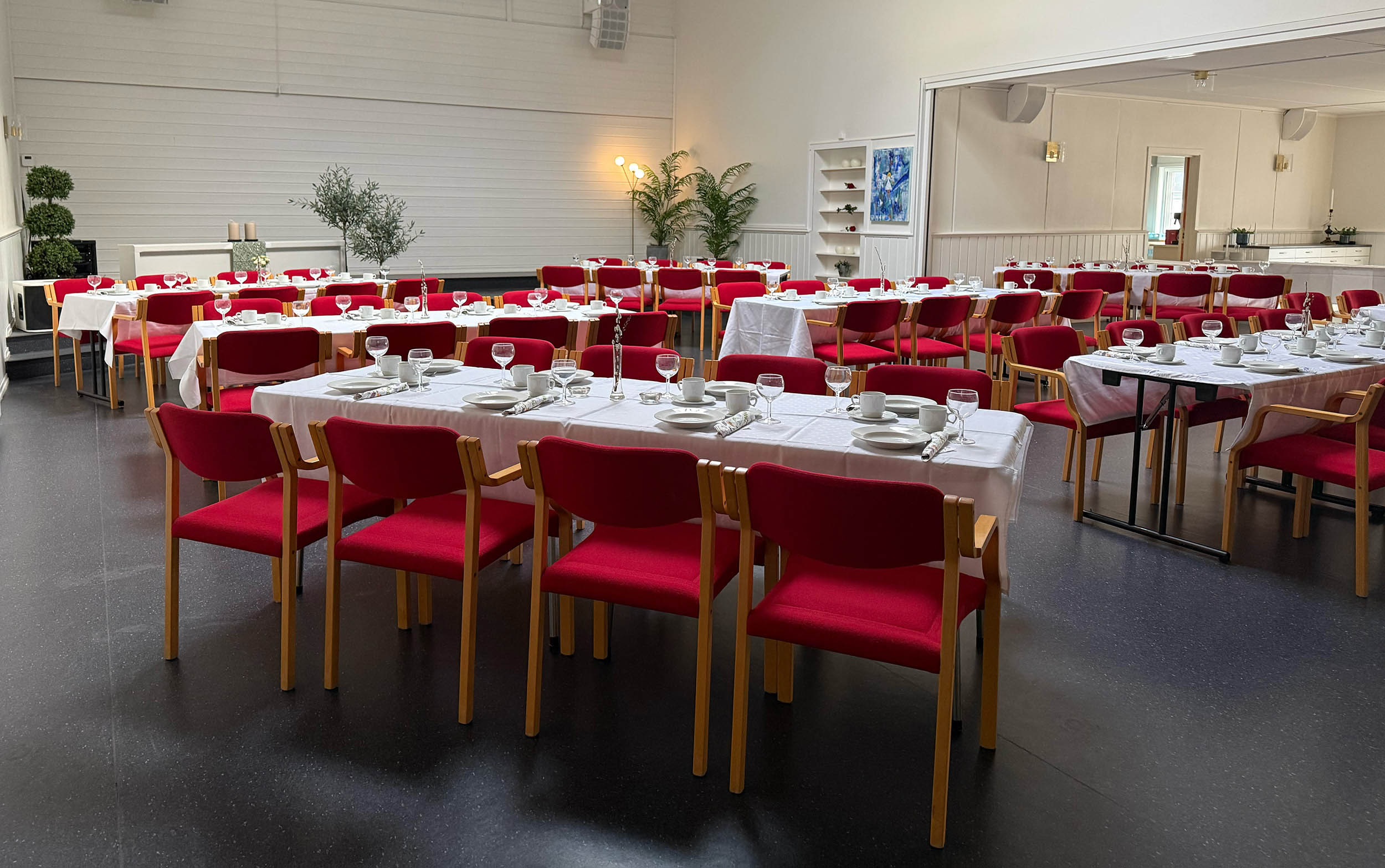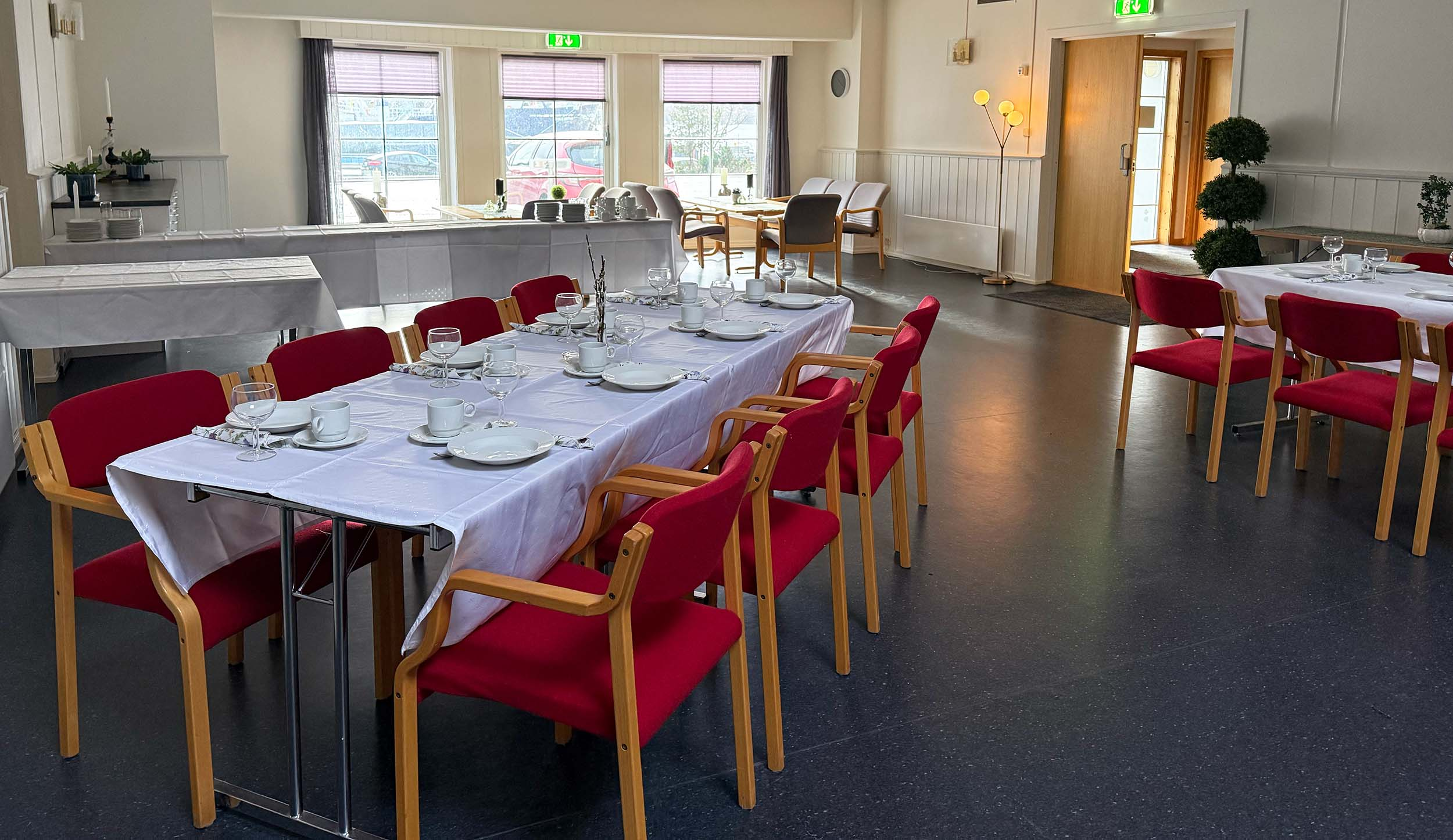 I lokalene våre i Måløy har vi også eget lokale som kan brukes til minnestund og/eller til selve gravferdsseremonien. Våre servitører kan dekket bord og gjøre klart til dere kommer, dette er også noe dere kan velge å gjøre selv. Det er mulighet for å strømme musikk samt vise bilder på storskjerm om det skulle være ønskelig.