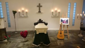 Vi hadde ingen kistedekorasjon, men broren sin skinnjakke og cowboyhatt.